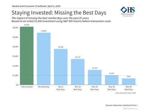 This is the foundation of why staying invested and taking advantage of lower stock prices has historically been the best approach. Some may be tempted to time the market, but the challenge is twofold - knowing when to get out, and also knowing when to get back in. The market's best days have often occurred shortly after its worst days, so investors who step to the sidelines often miss the very rebounds they were waiting for.
